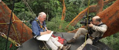 Photo : Francis Hallé avec Luc Marescot (à dr.) pour son film Poumon vert et tapis rouge © DR