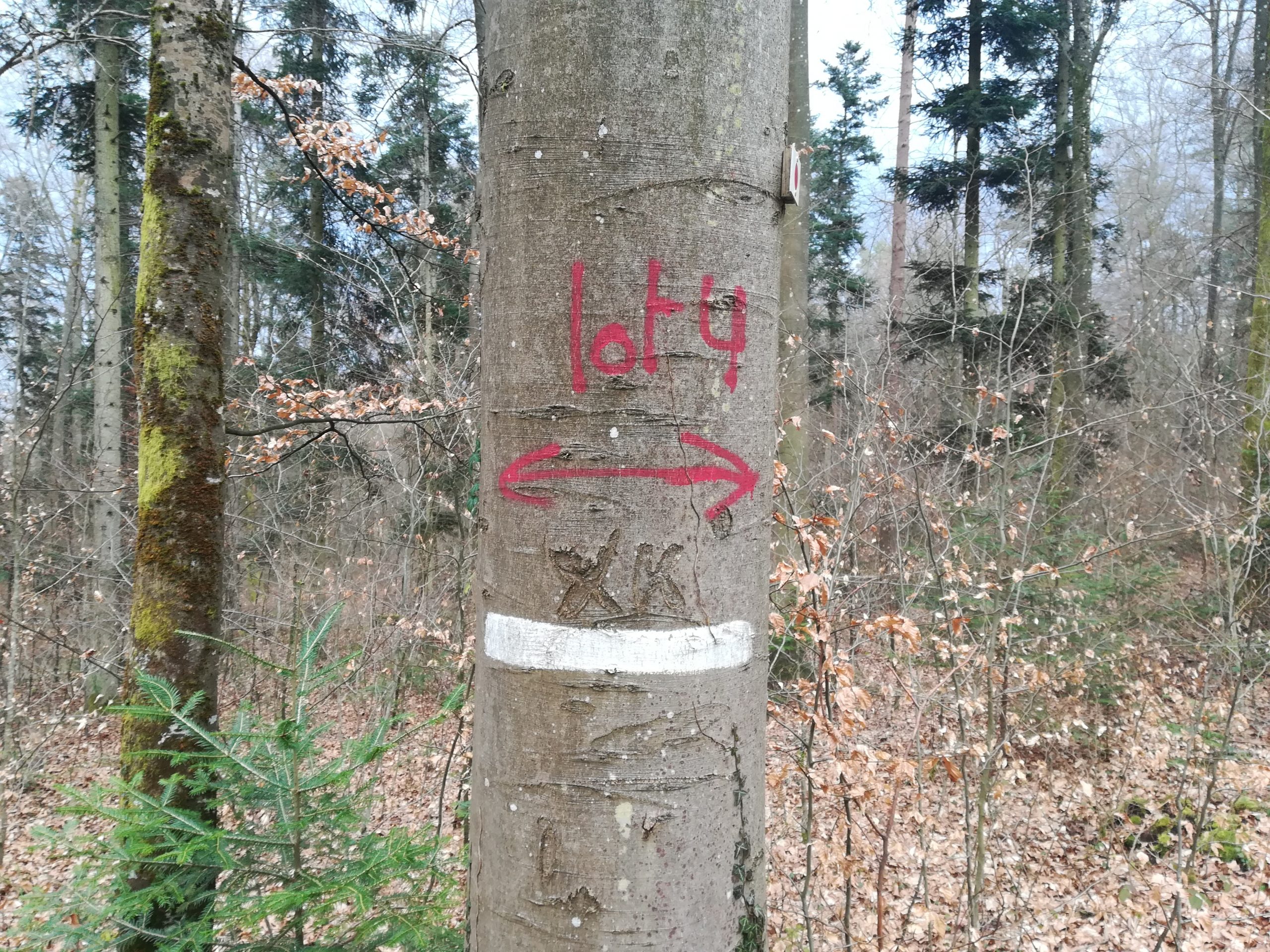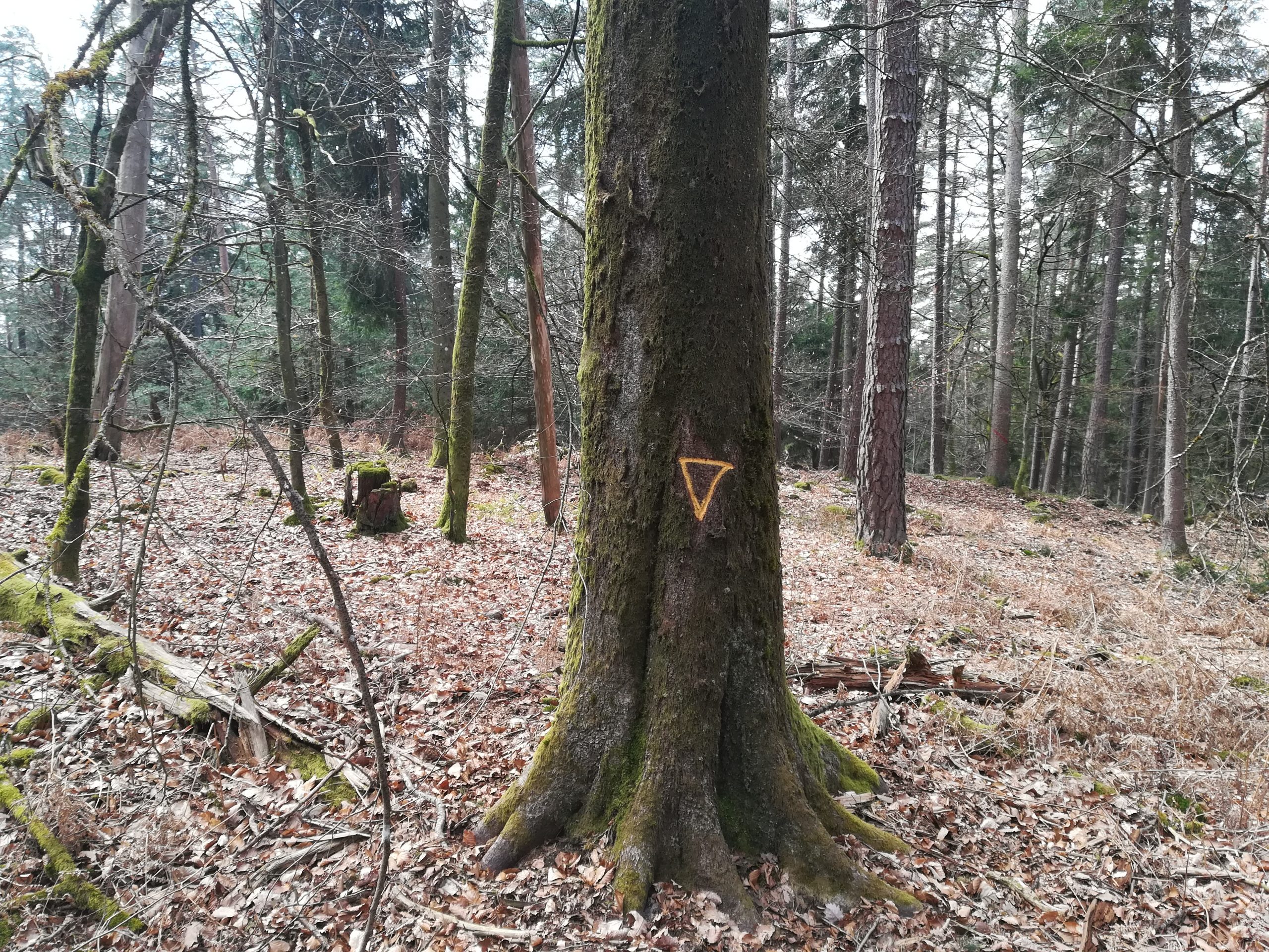 En général, les couleurs chaudes (rouge) indiquent les arbres à enlever tandis que les couleurs froides (blanc, vert, bleu) sont utilisées pour des marquages pérennes ou directionnels (cloisonnements indiquant des voies d’accès pour le débardage des grumes). Pour qui est observateur, impossible de marcher dans les forêts des Vosges du Nord sans voir ces « tags sylvicoles » qui soulignent que la forêt est bien une usine à bois, un terrain de chasse et un lieu de loisirs car il ne faut pas oublier le marquage des multiples sentiers pédestres et des parcours de VTT à l’aide de plaquettes métalliques fixées sur les arbres.